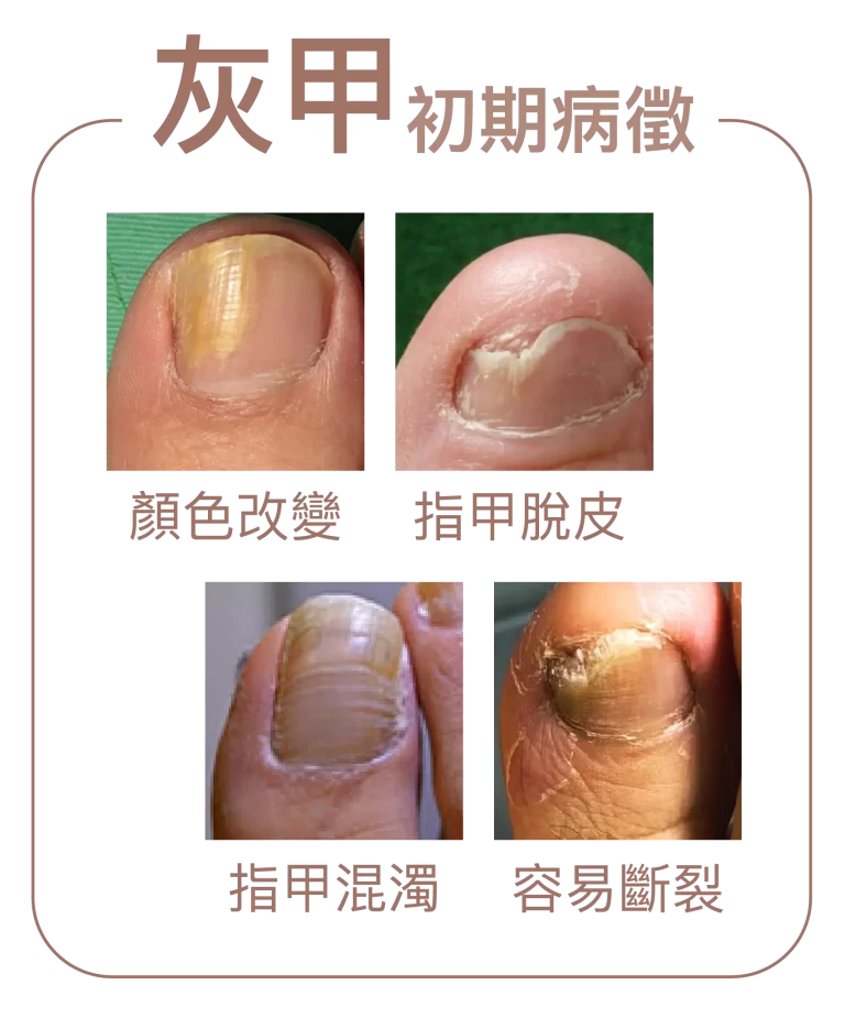 早期灰甲大多不會有痕癢痛楚等病徵。灰甲可影響手指或腳趾,而大腳趾通常最先受感染。
